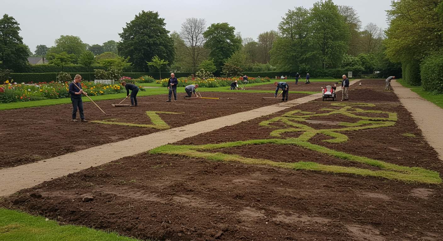 Работы по подготовке земли начинаются с очистки участка от старой растительности, мусора и камней. Далее следует геодезическая съёмка и разметка, что позволяет определить перепады высот и спланировать будущие цветники, клумбы и дорожки. После этого производится снятие верхнего слоя грунта, его выравнивание и при необходимости внесение плодородного грунта или компоста. На слабых или влажных участках рекомендуется использовать дренажные слои из песка или щебня для предотвращения застоя воды. Заключительным этапом является уплотнение поверхности, проверка ровности и внесение удобрений для обогащения почвы перед посадкой растений.